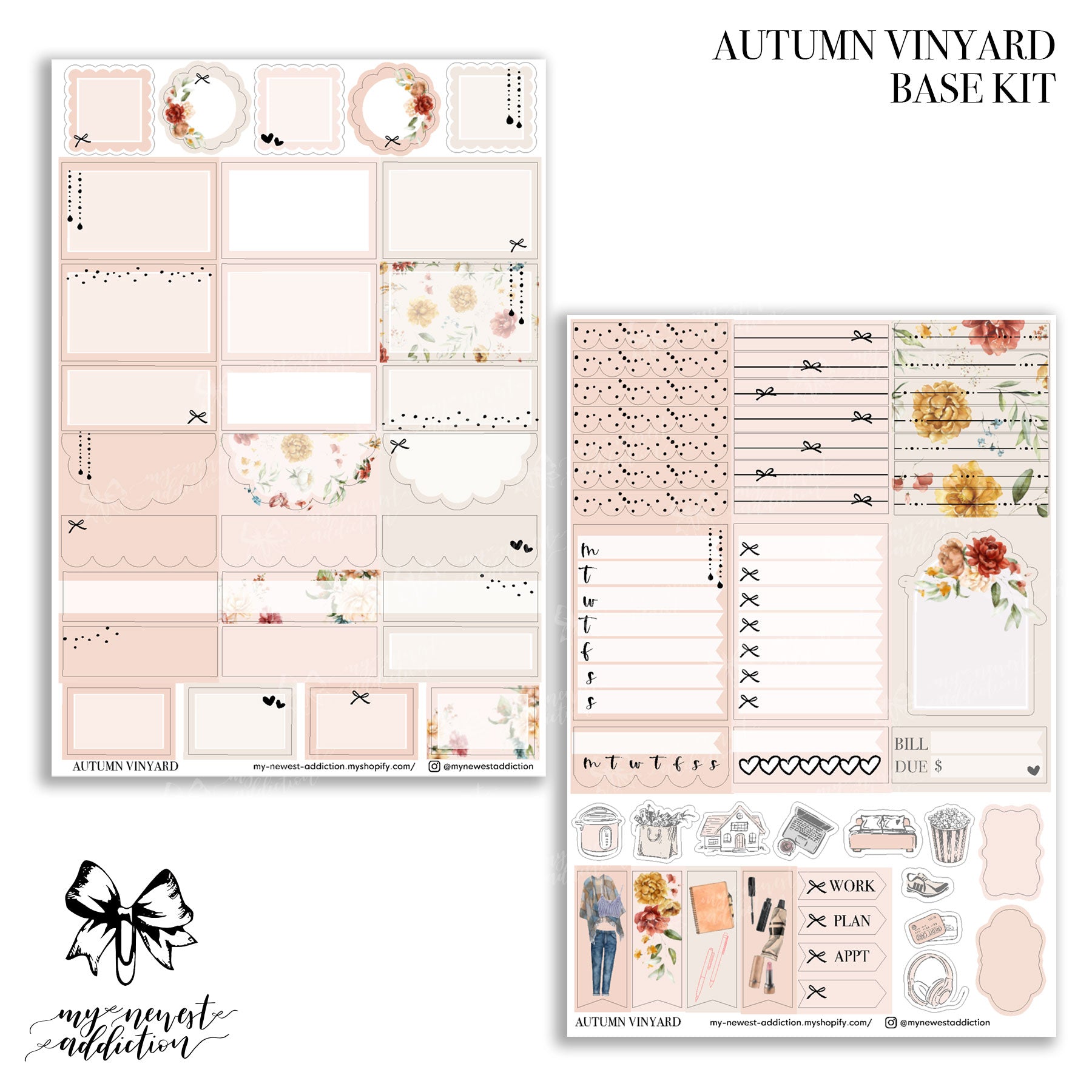 The base kit comes with 4 sheets (all foiled) and a sheet of date dots. Each page in this kit is 4.75 x 7.25 inches. This kit is perfect for full size planners.