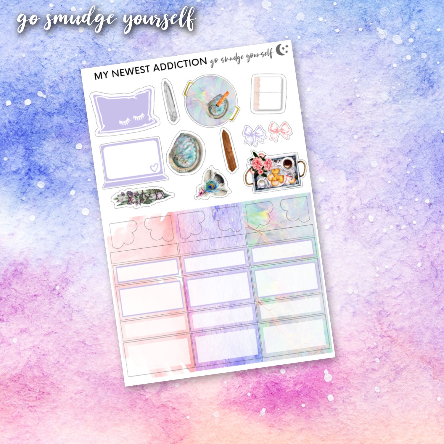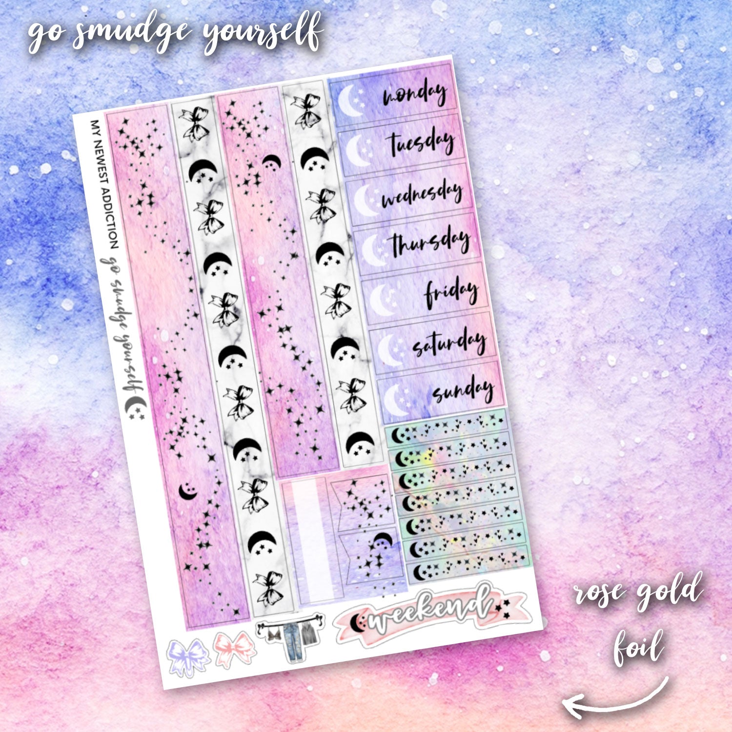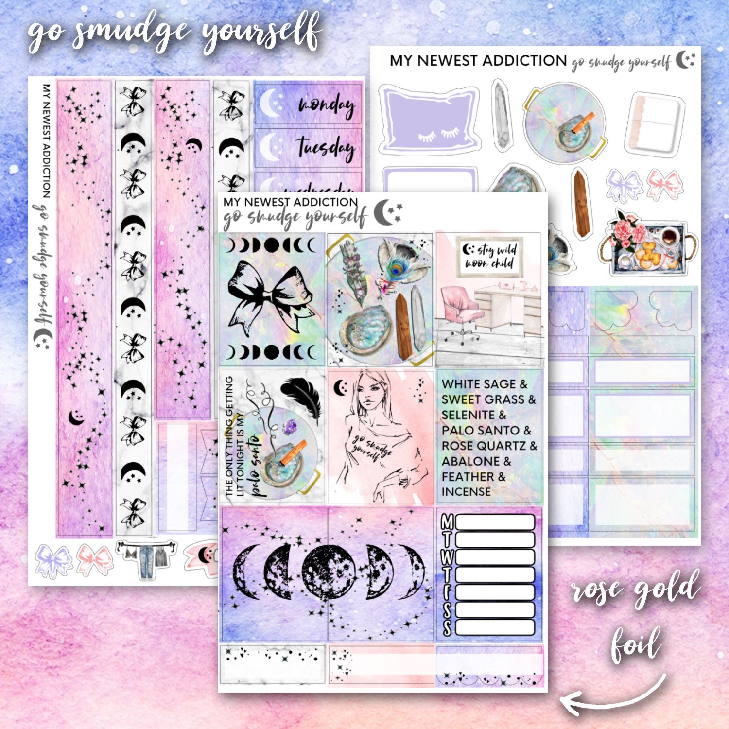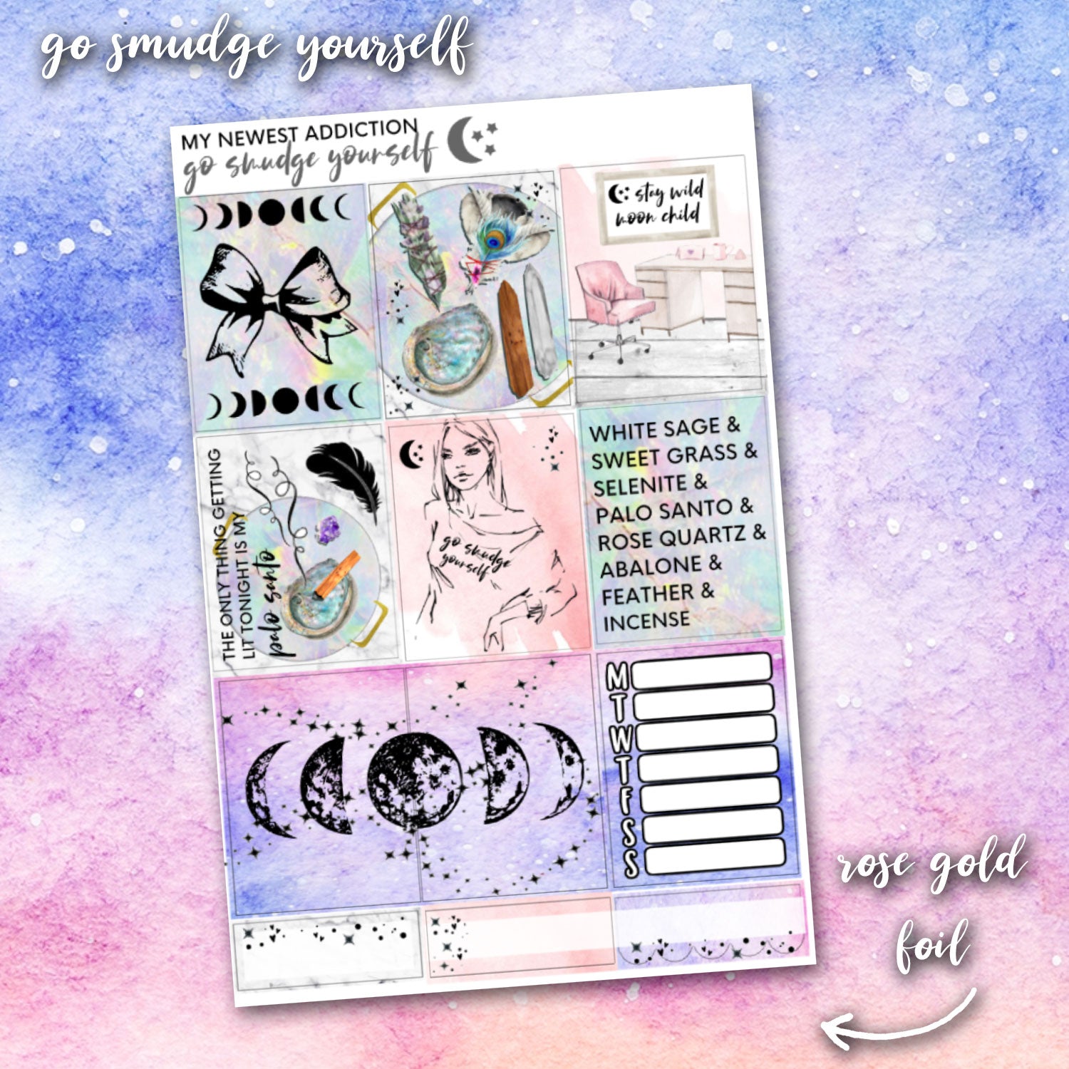 The "Go Smudge Yourself" limited addiction mini planner kit screams girly goddess.  If you are seeking inner peace and want to smudge out the negativity in your life, you need this.  This kit uses ethereal tones mixed with rose gold foil for an aesthetically pleasing palette.