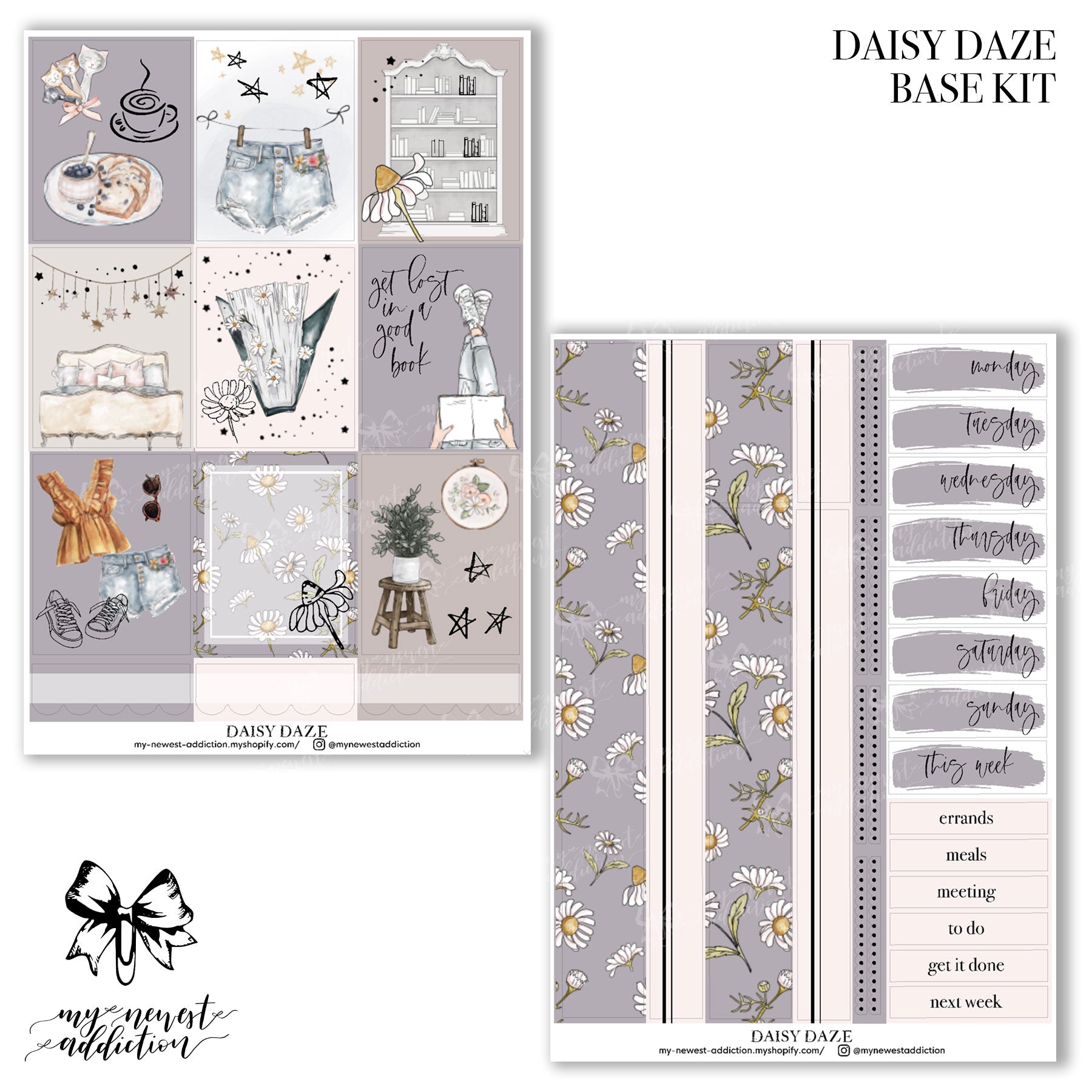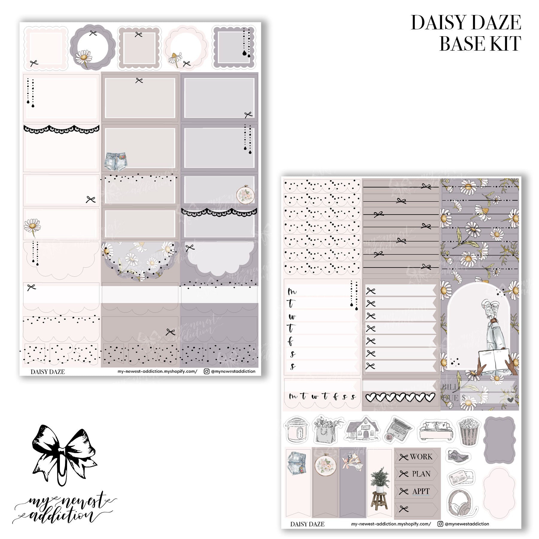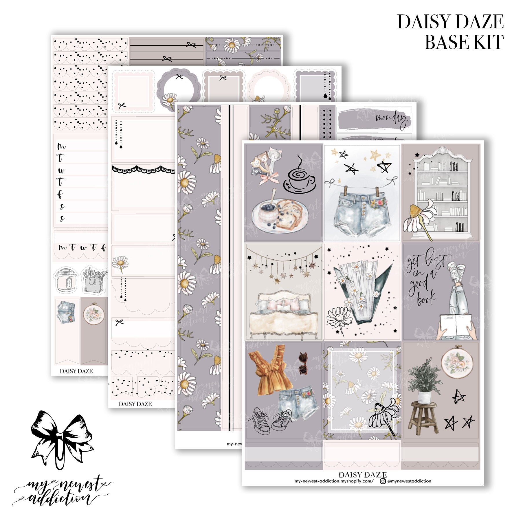 The base kit comes with 4 sheets (all foiled) and a sheet of date dots. Each page in this kit is 4.75 x 7.25 inches. This kit is perfect for full size planners.