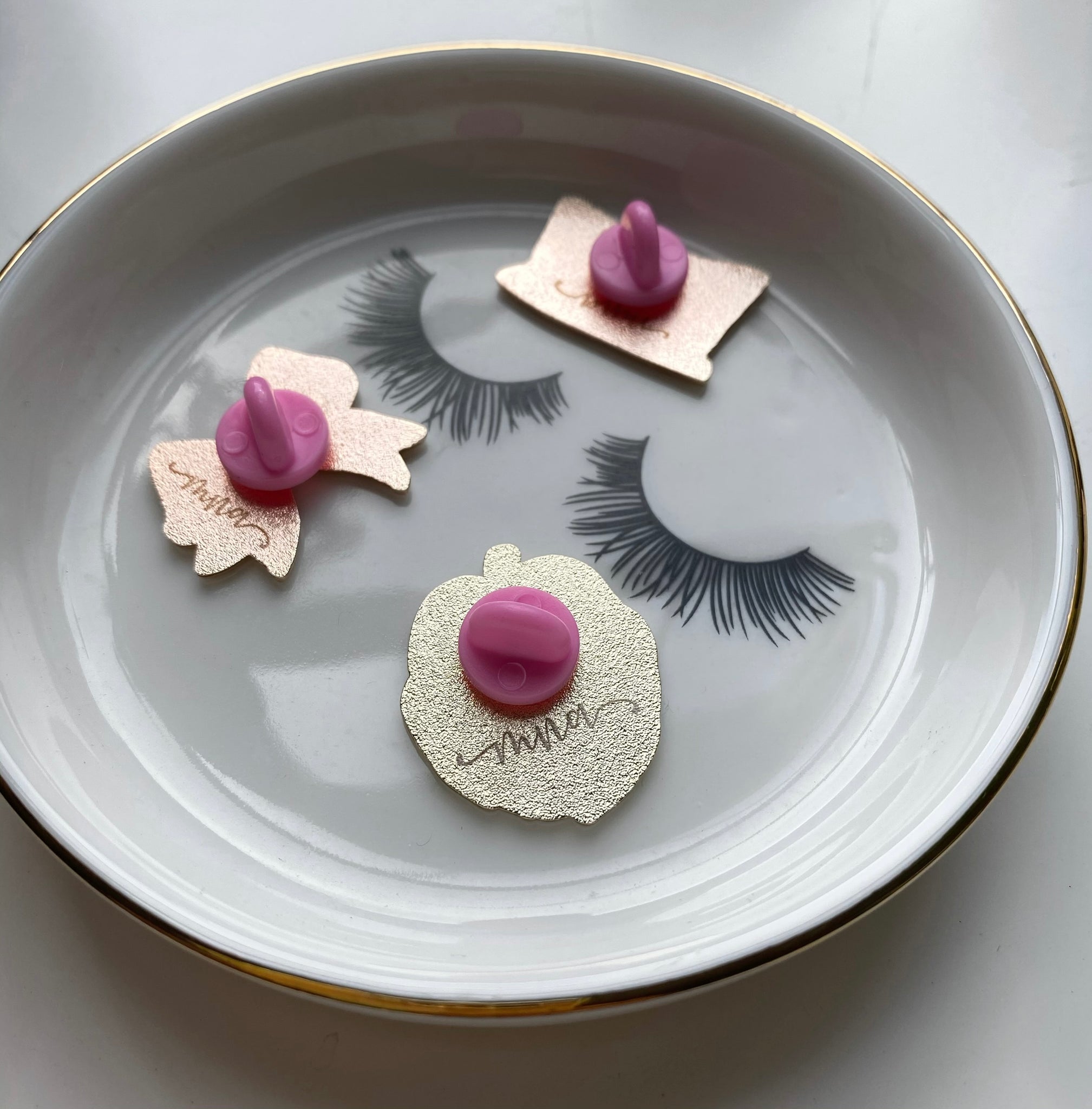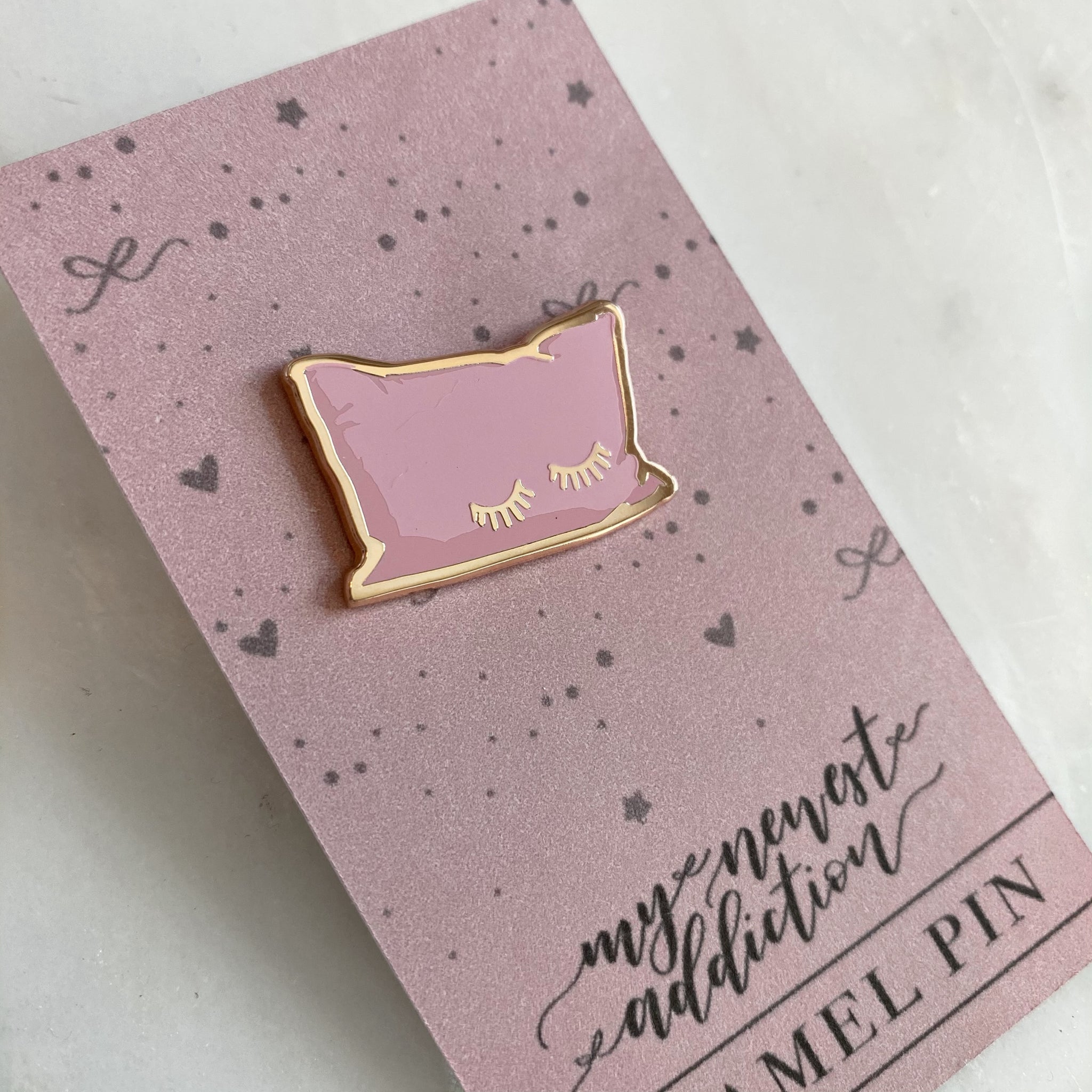 Pillow Talk is the ICONIC pink pillow with lashes, rose gold detail, and a pink post backing.