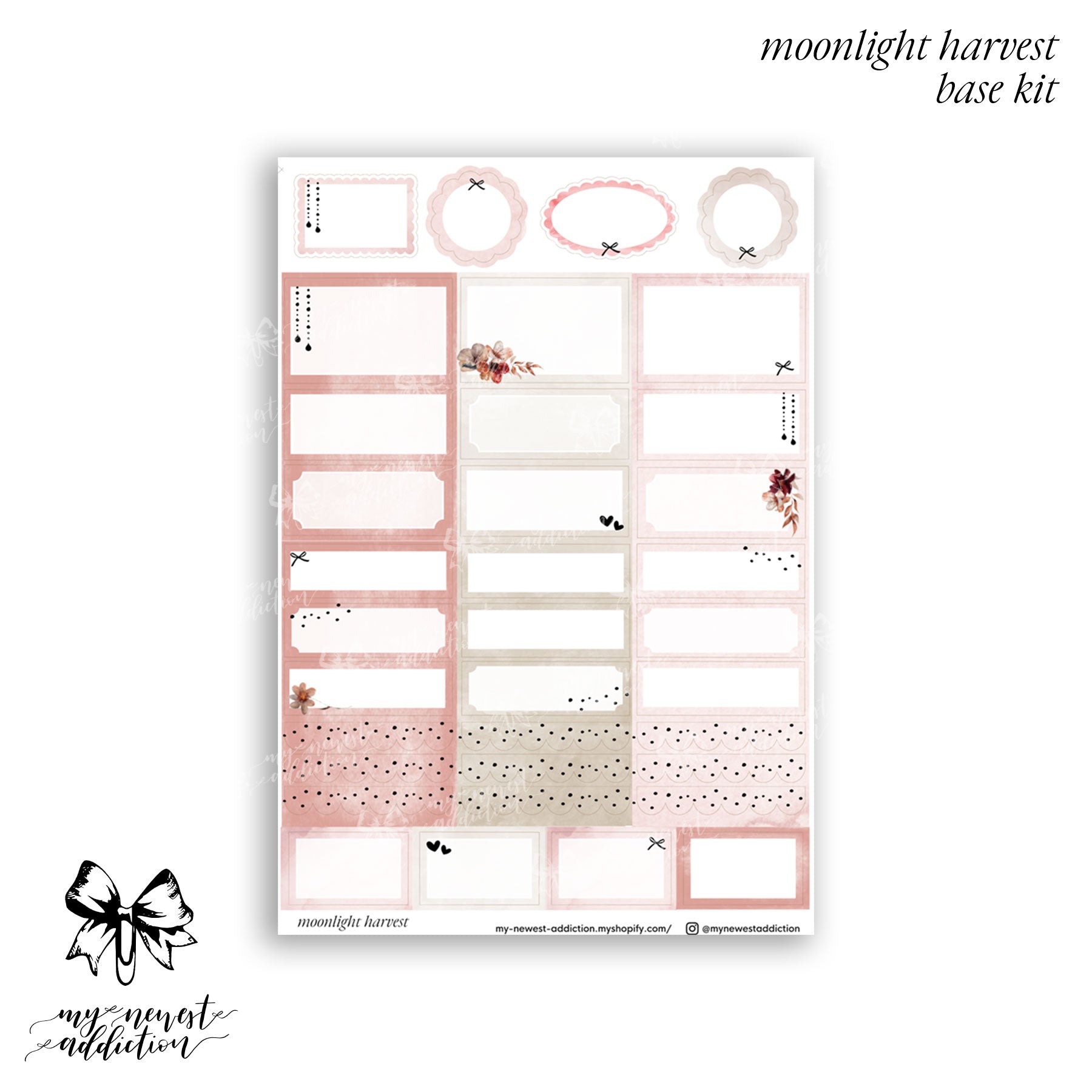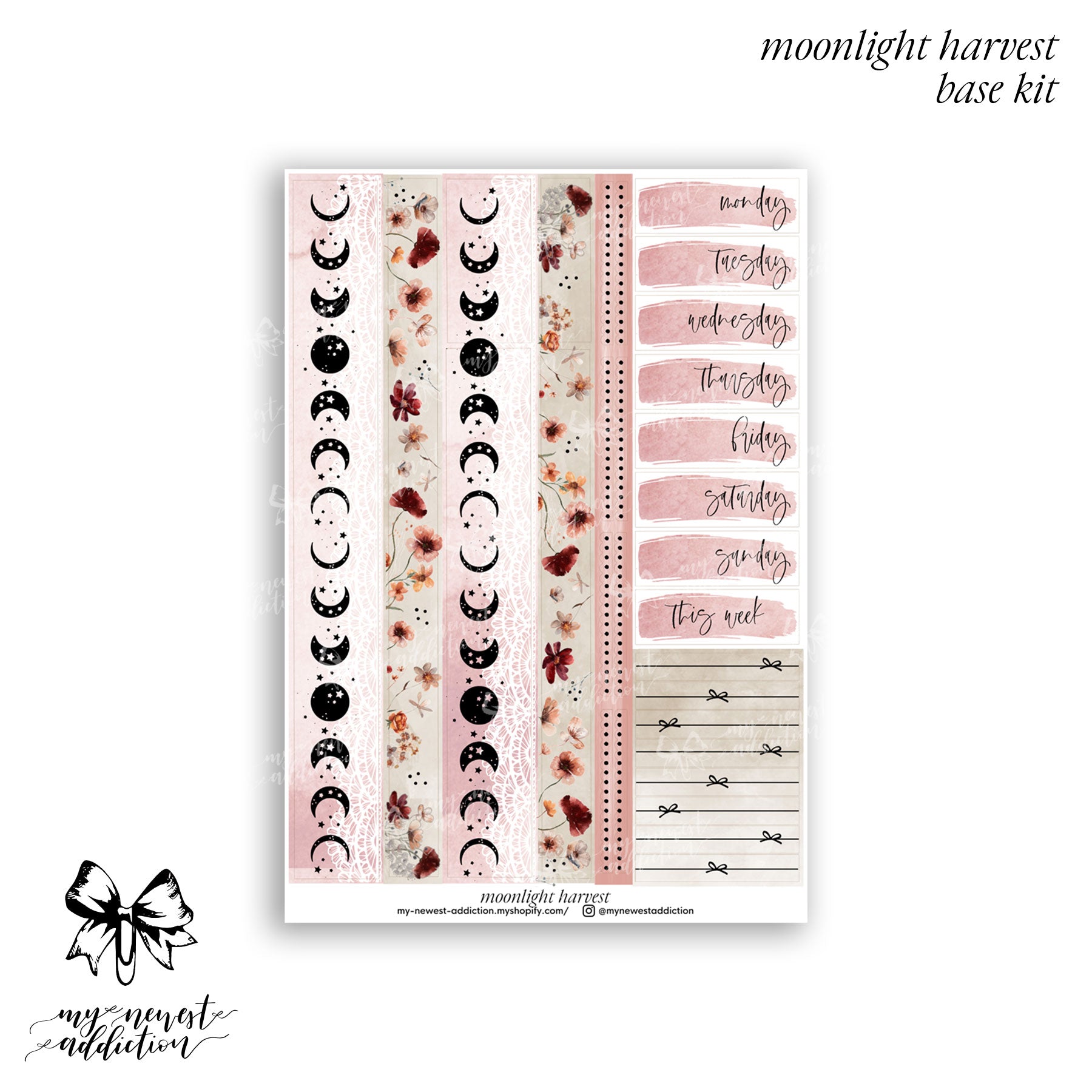 The base kit comes with 3 sheets (all foiled) and a sheet of date dots. Each page in this kit is 4.75 x 7.25 inches. This kit is perfect for full size planners.