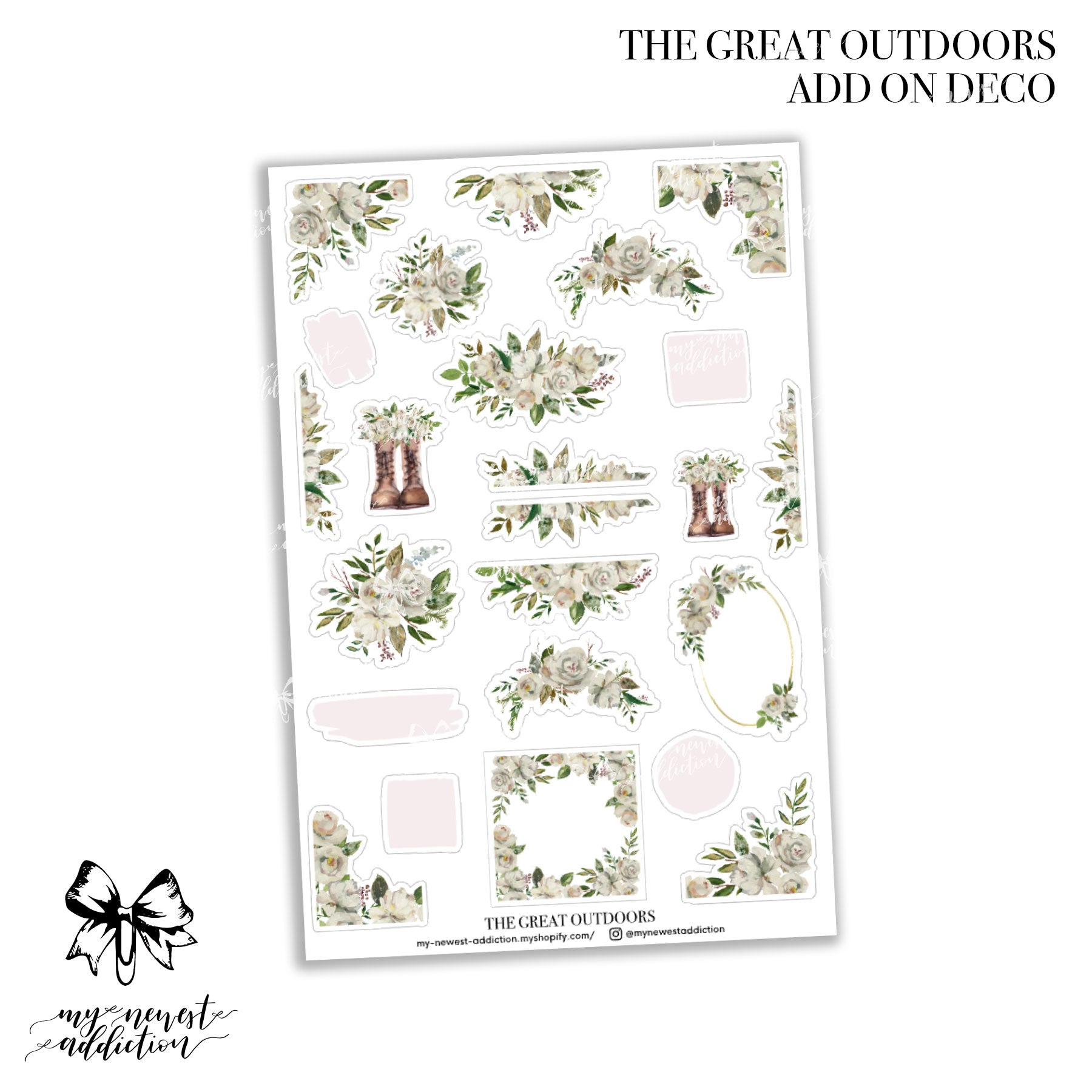 The add on deco sheet is approximately 4.5x7 inches.  It is printed on transparent paper and is NOT foiled.  It is perfect for adding deco to your planner spreads or journaling.