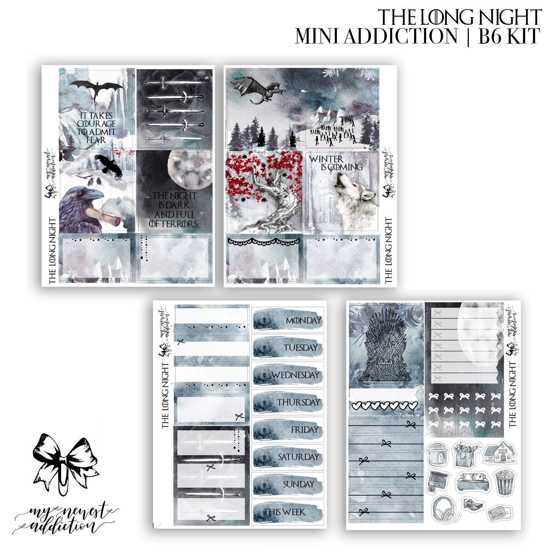 The Mini Addiction comes with 4 sheets (all foiled) and a sheet of date dots. Each page in this kit is 3.5 x 4.75 inches. This kit is perfect for smaller planners.